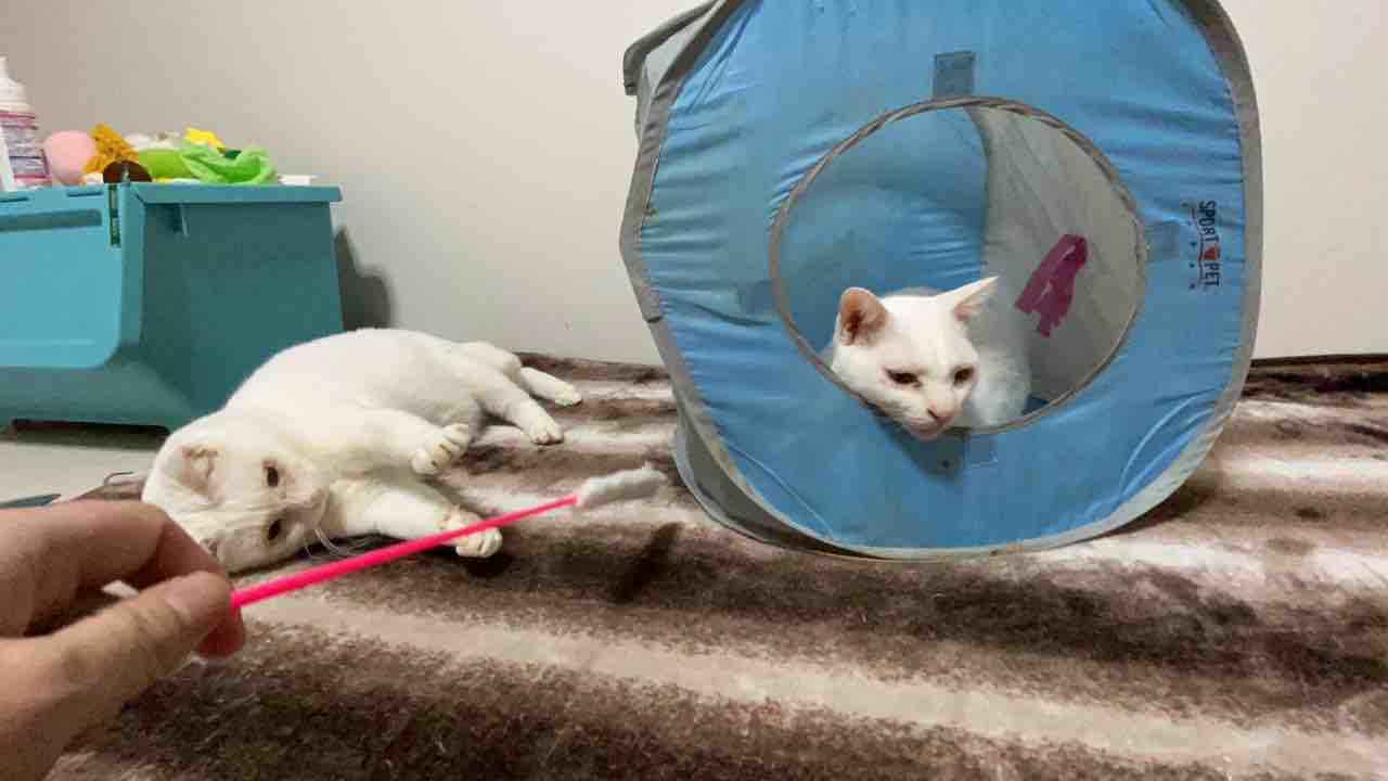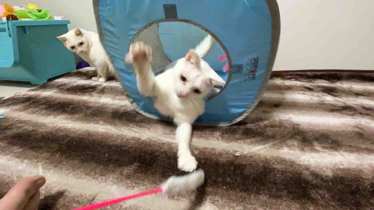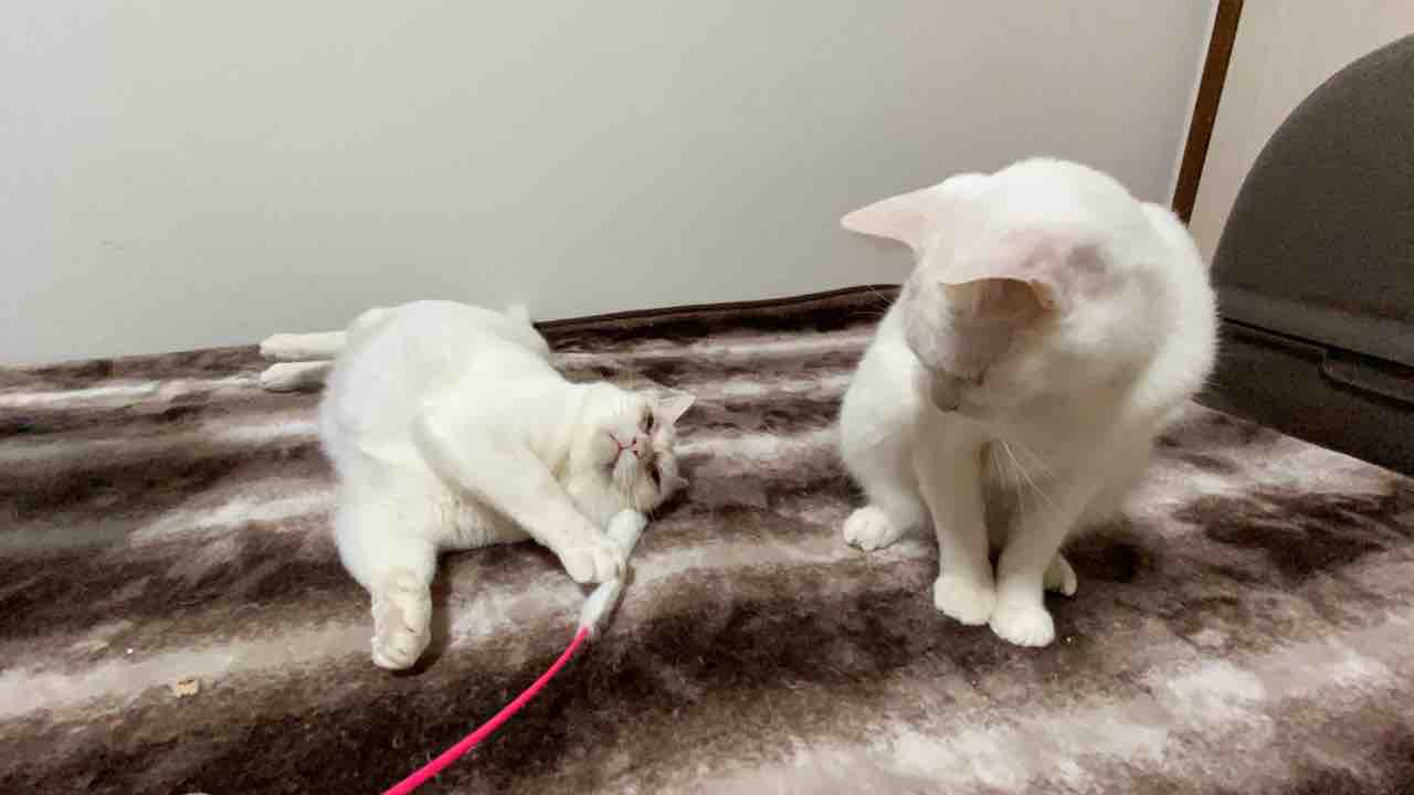 でも、この猫キューブとじゃらしで遊ぶふたり。
