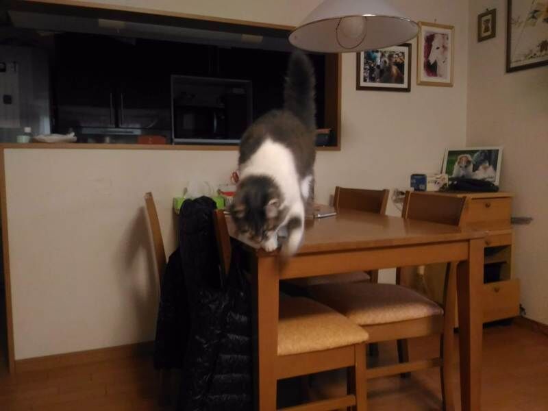 ダイニングテーブルの上に土足で上ってた銀次がユリ母を迎える体勢に