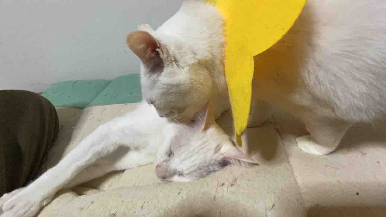 麿白先生をグルーミングしていたわる曉璘。いろいろな過去があり、ここで多くの猫と出会い、そして何度かの別れを経て猫として成長した曉璘。