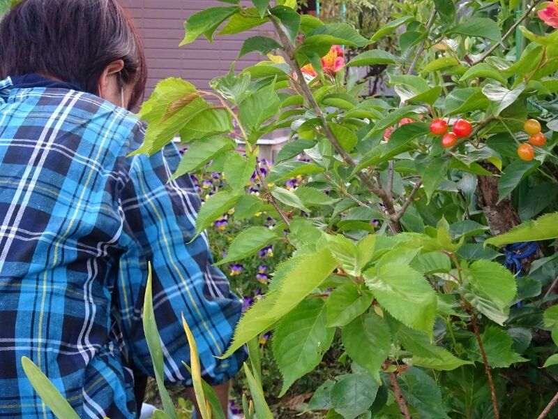 気温の上昇は良いけど、草が伸びるのも早いよ。 夕方、妻は草取りとあちこちに出て誇ってるビオラ(ミニパンジー)を整理してました。 すると、横の枯れ枝にサクランボが生ってますよ。 桜の木は、虫が入り易いので、なかなか大きくならないもんね。 鳥が先か、孫たちが先か勝負だね。