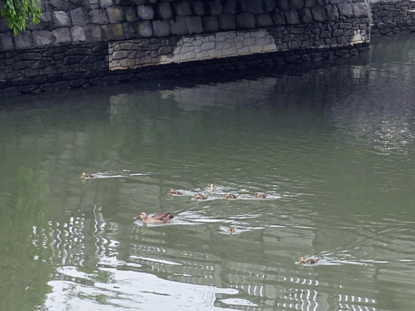 人工の小川から引っ越した8羽の子ガモの家族は,どんどん西の方へ移動し,