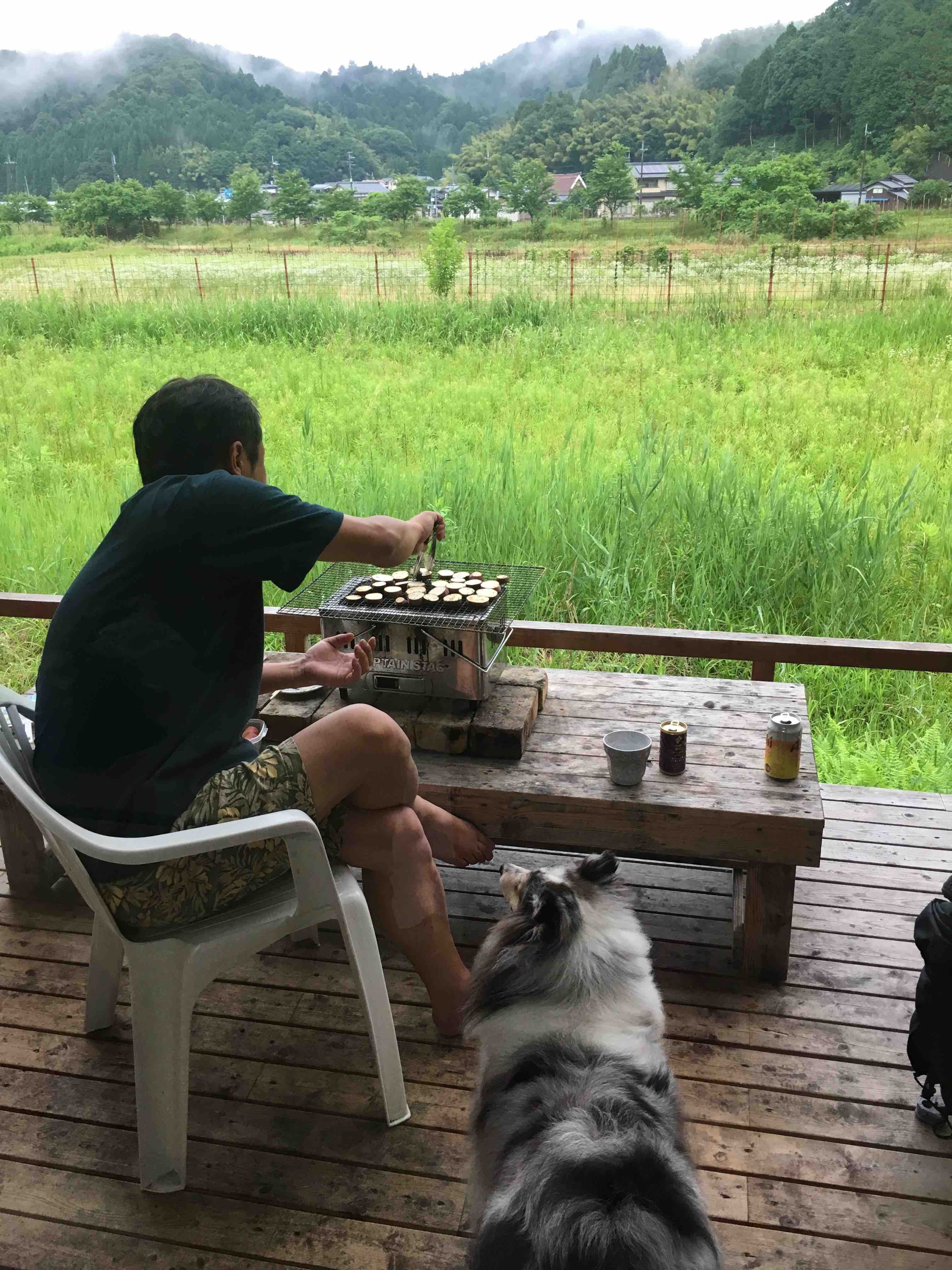 BBQで弱火で肉をじわじわ焼くおっさん。