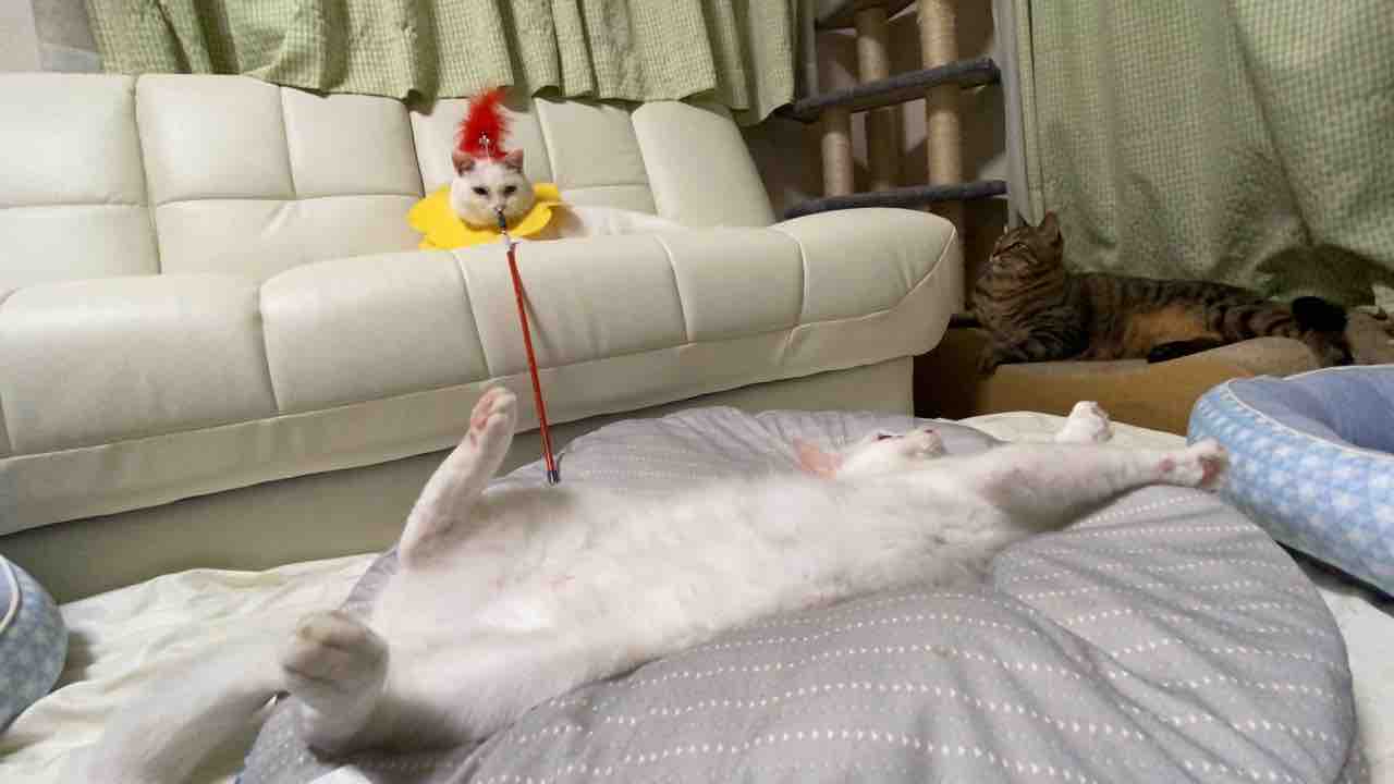 遊びおわると、麿白先生と時雉が軽く猫レスリングしてました。