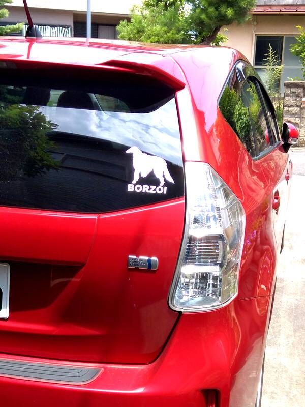 赤い車に貼るボルゾイステッカーをデザインしてみた 殺風景なリアウインドウの右隅に貼ってみた バ~~ン!!! 陸ぼんの出入り口、左のリアドアのウインドウには 陸ぼん専用ステッカーです(笑) レイラインshopで購入しました あなたを待っている子がいます 里親募集LEY-LINE にほんブログ村