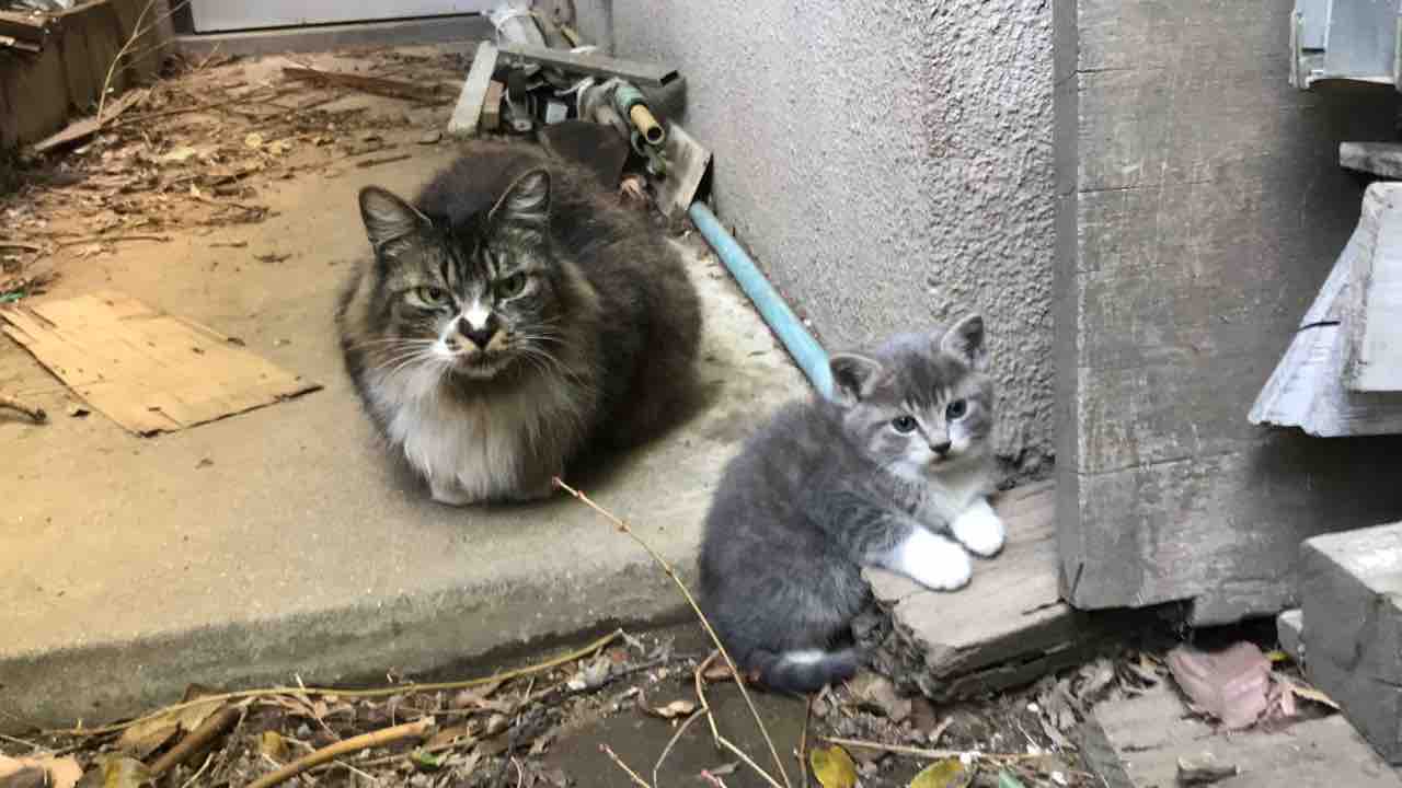 見知った黒猫を追いかけたら、何か因縁の猫が子猫を連れて待ってました。