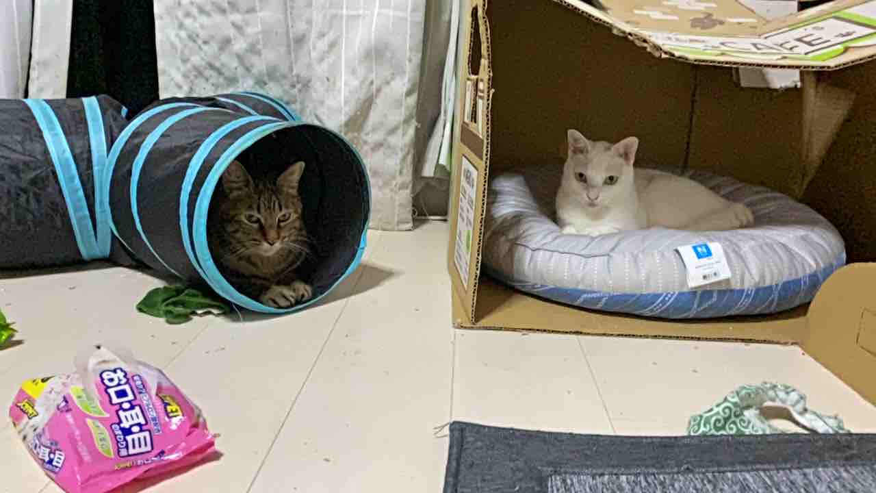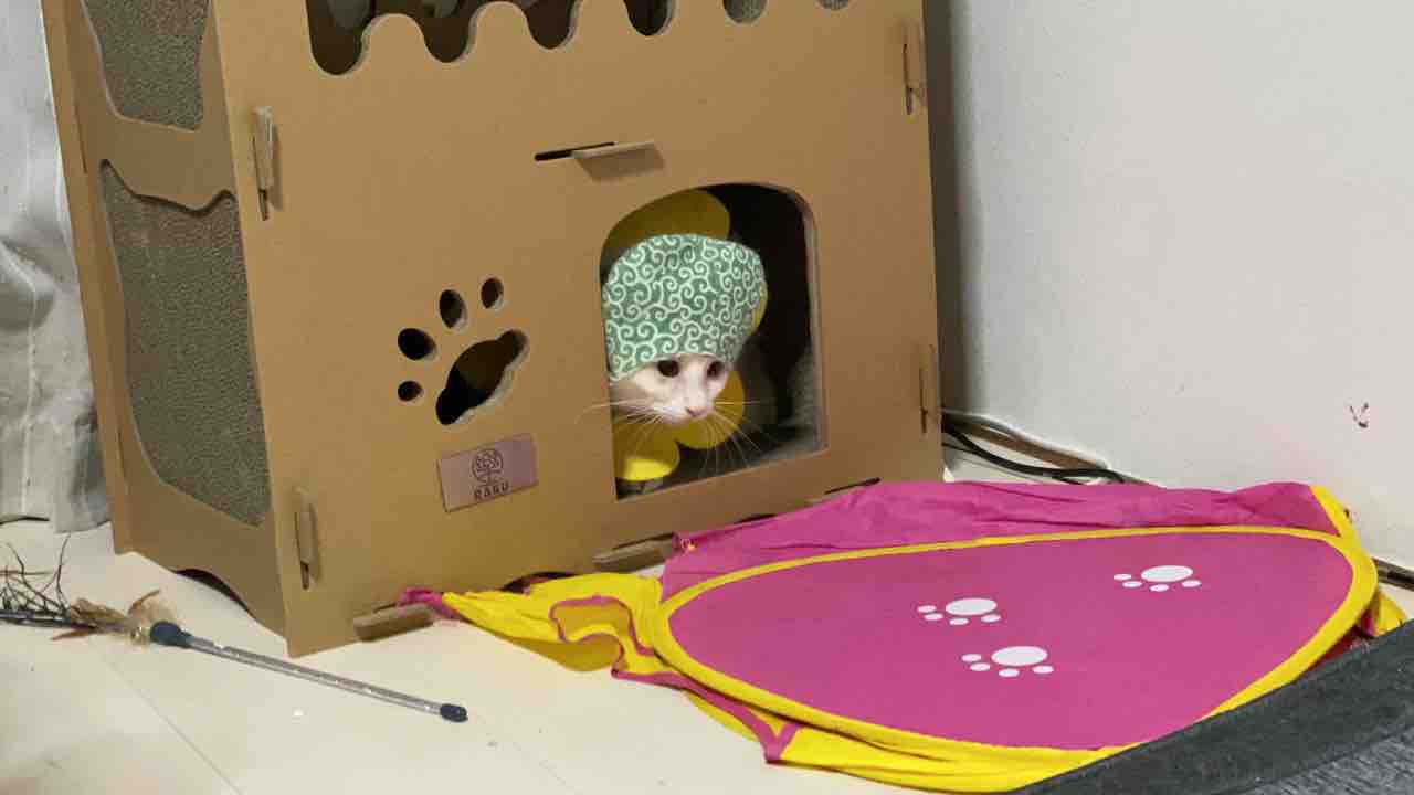 曉璘がいつも占拠してる破れかけの猫テント。このあと、預かり子猫のみうちゃんにべこべこに乗られます。