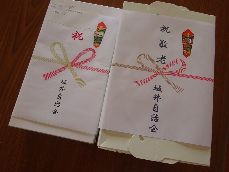 8時から10時まで公民館に詰めて、75歳以上の方(当自治会からは70歳以上の方)へ市よりの記念の品(右が市からの記念品で、左が自治会からの紅白餅です。)を配りました。