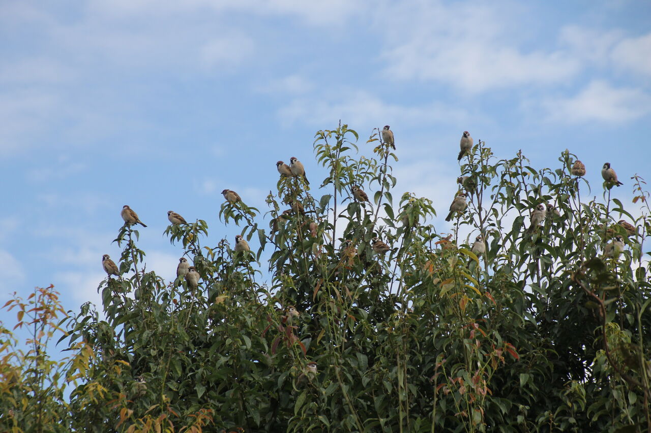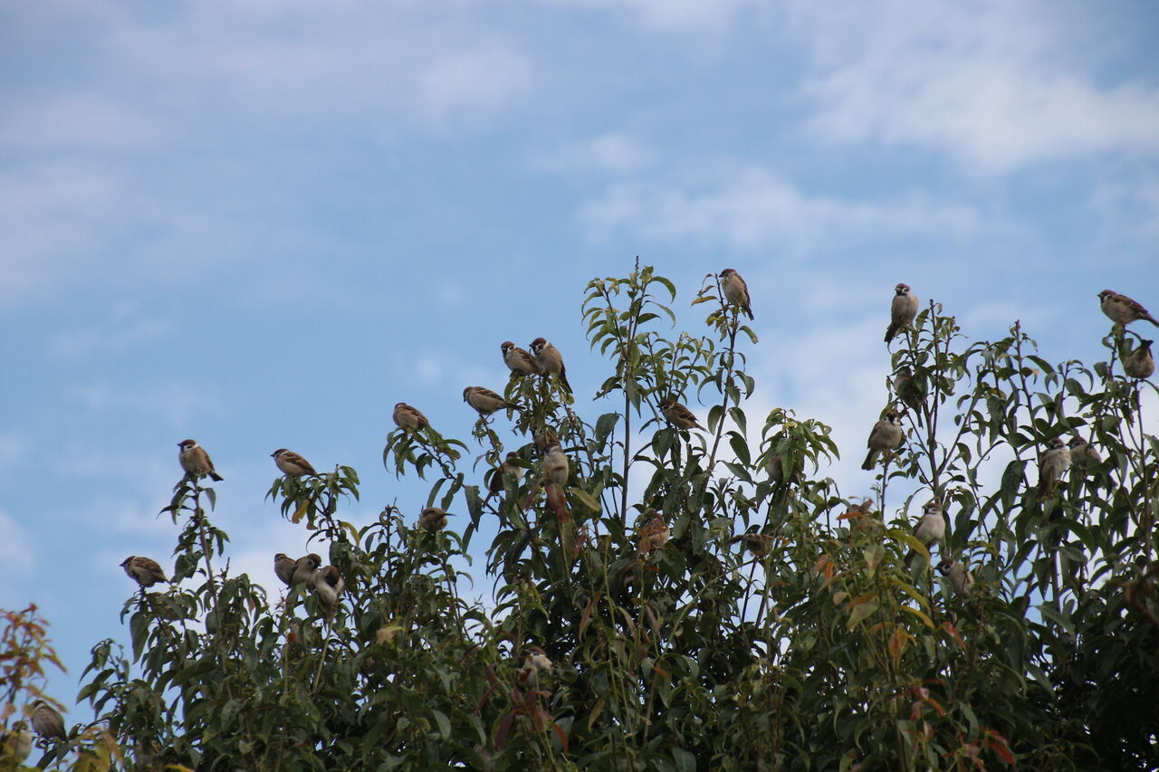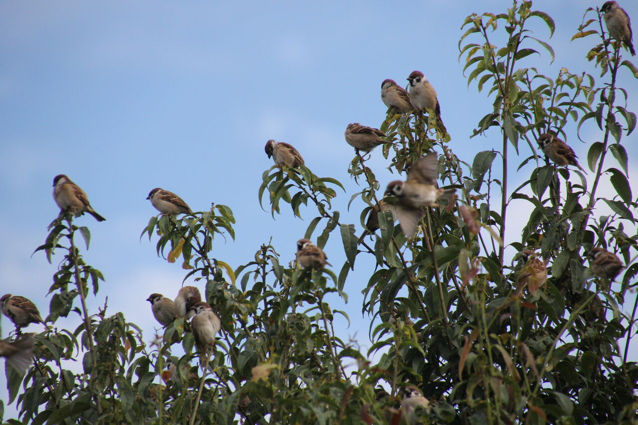 我が家の庭の樫の木に集うスズメ隊